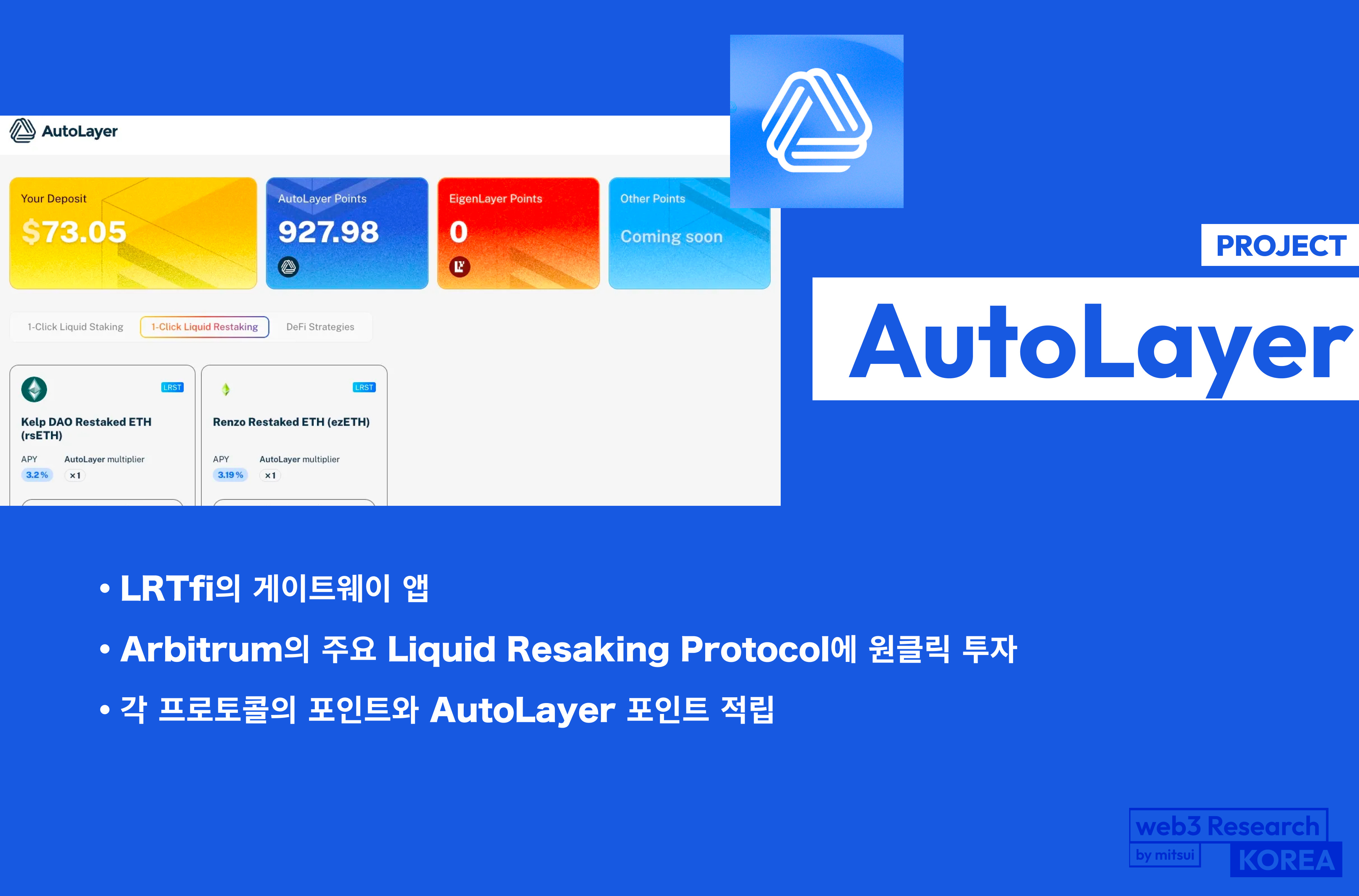 'AutoLayer'는Arbitrum의 주요 Liquid Resaking Protocol에 원클릭으로 투자할 수 있는 LRTfi의 게이트웨이 앱으로, LRT와 LST에 대한 투자와 이후 DeFi 운용(LRTFi)도 하나의 앱에서 진행할 수 있다.