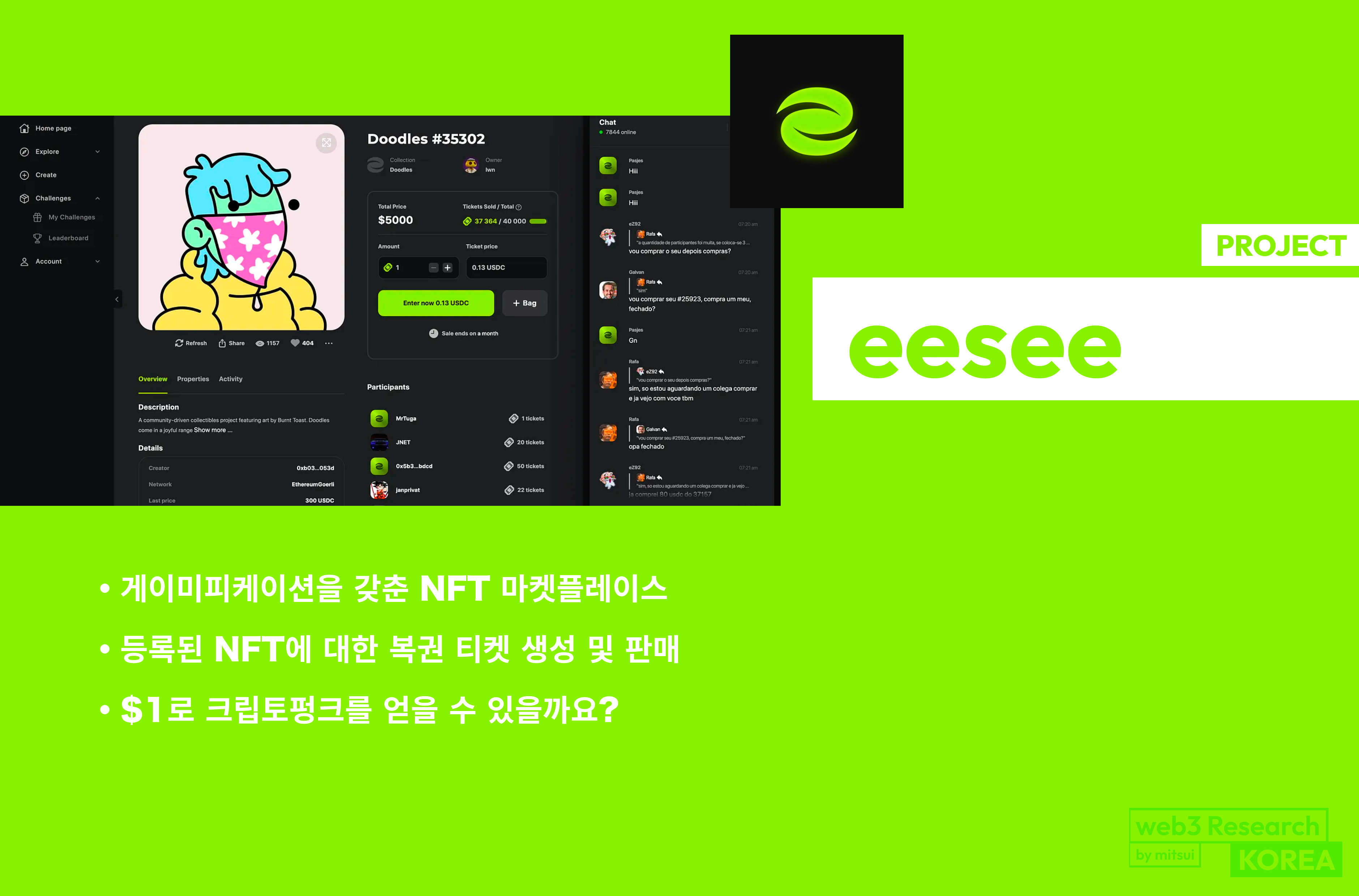 【Eesee】게이미피케이션을 갖춘 NFT 마켓플레이스 / 등록된 NFT에 대한 복권 티켓 생성 및 판매 / $1로 크립토펑크를 얻을 수 있을까요?