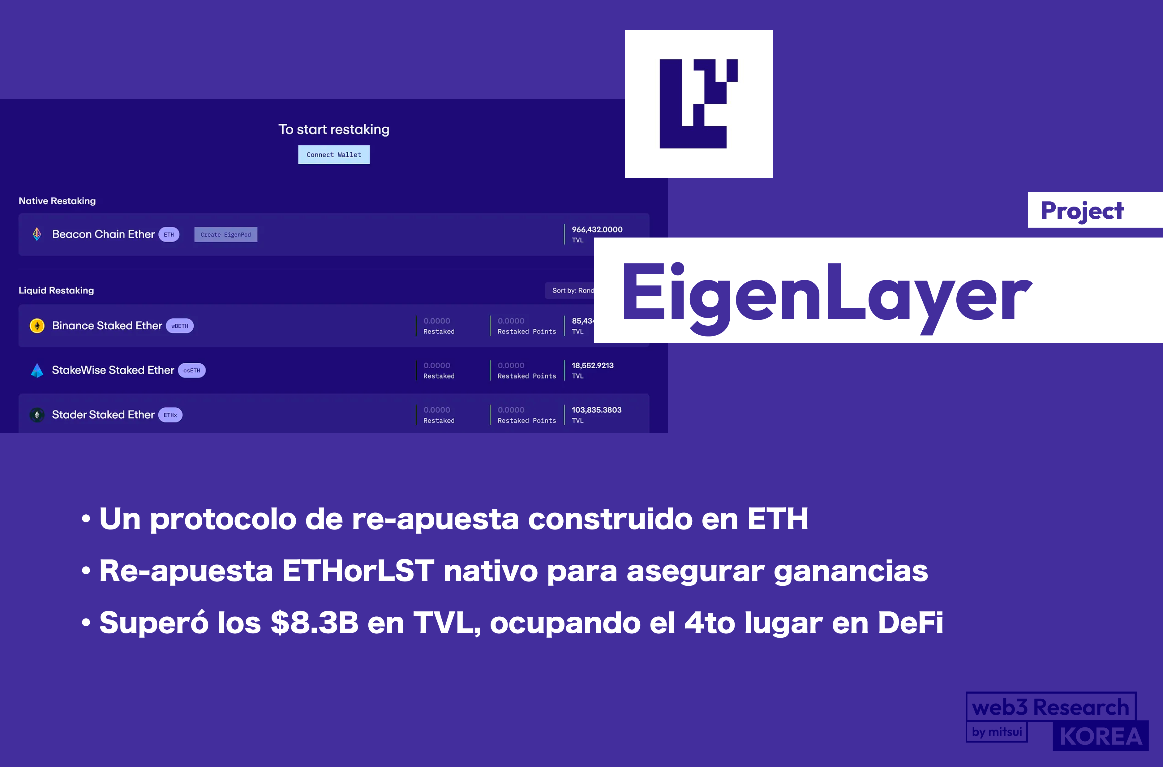 【EigenLayer】ETH 위에 구축된 재스테이킹 프로토콜 / 원래의 ETH 또는 LST를 재스테이크하여 수익을 확보 / TVL에서 8.3B달러를 초과하여 DeFi에서 4위 / @eigenlayer