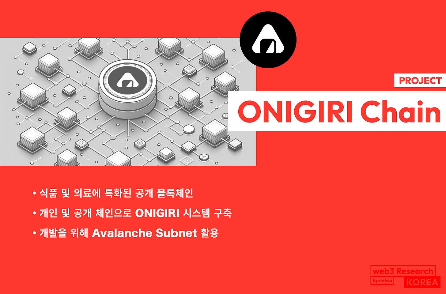 "ONIGIRI Chain"은 음식과 의료에 특화된 공개 블록체인입니다. SARAH 주식회사가 개발한 독특한 블록체인으로, Avalanche Subnet을 활용한 "SARAH"이라는 미식 앱을 개발합니다.