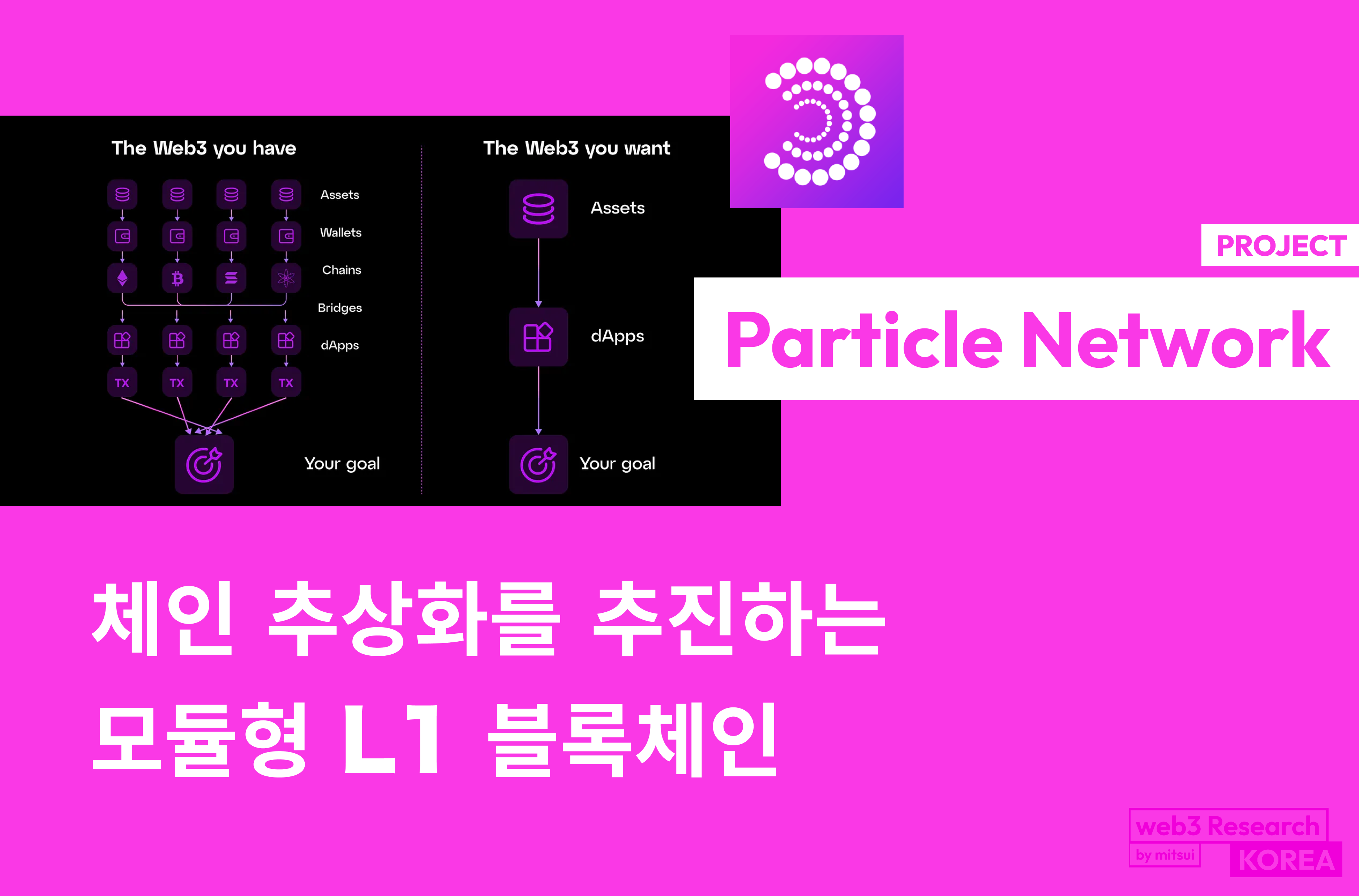 'Particle Network'는체인 추상화(Chain Abstraction)를 추진하는 모듈형 L1 블록체인으로, 웹3.0 시장의 사용자 및 유동성 파편화를 해결하는 것을 목표로 하고 있다.