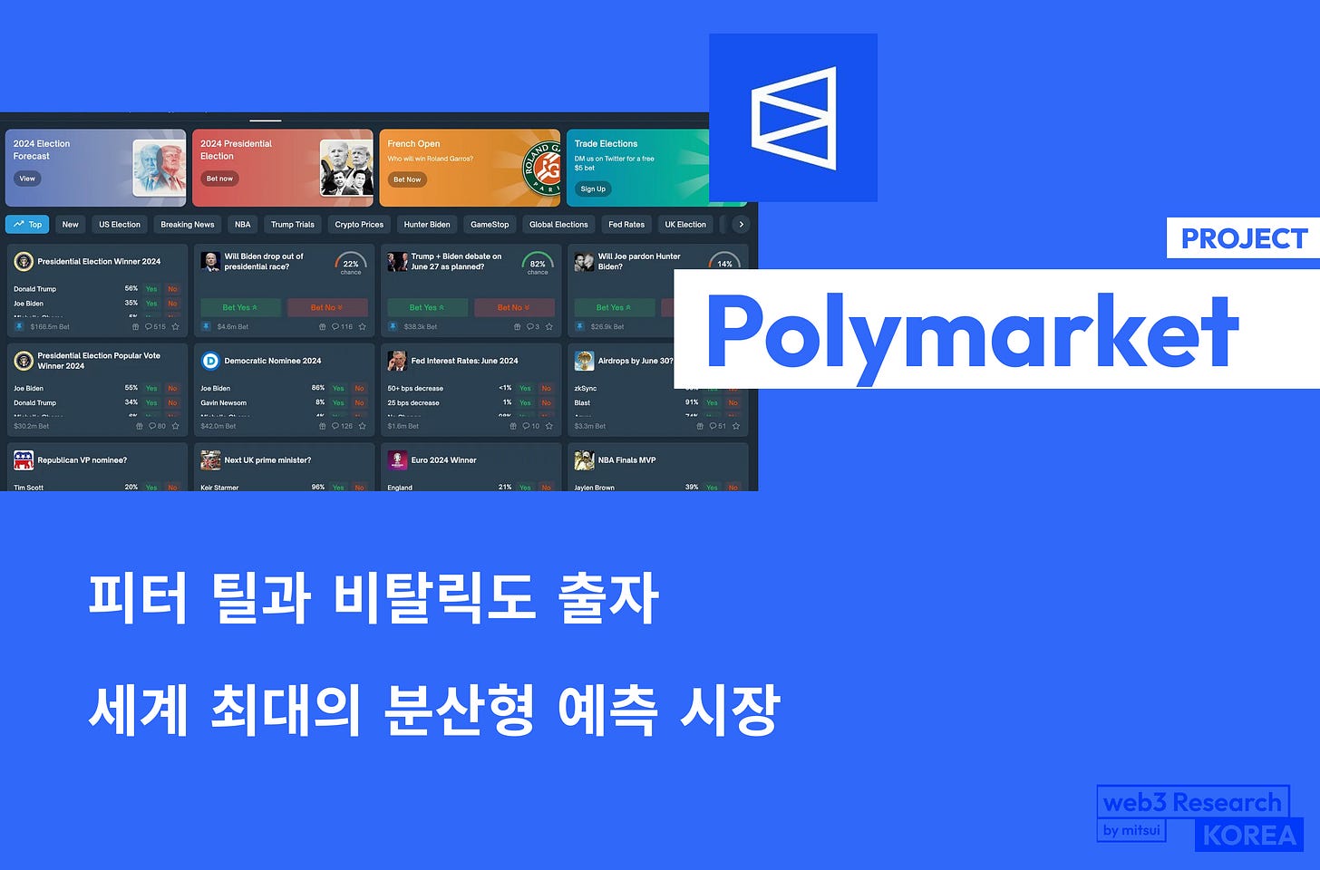 【Polymarket】세계 최대 규모의 분산형 예측 시장 / 정치, 스포츠, 암호화폐, 엔터테인먼트 등의 결과를 예측하고 베팅 / 피터 틸, 비탈릭도 투자 / @Polymarket