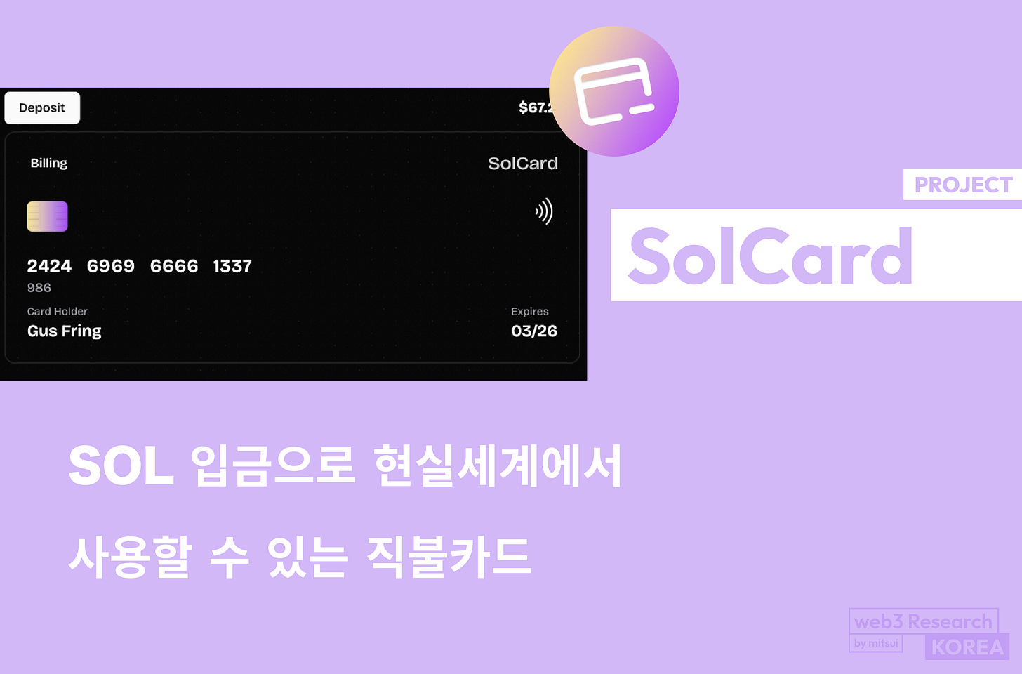 'SolCard'는 이름 그대로 Solana의 카드로, Solana를 입금하여 사용할 수 있는 직불카드입니다.
