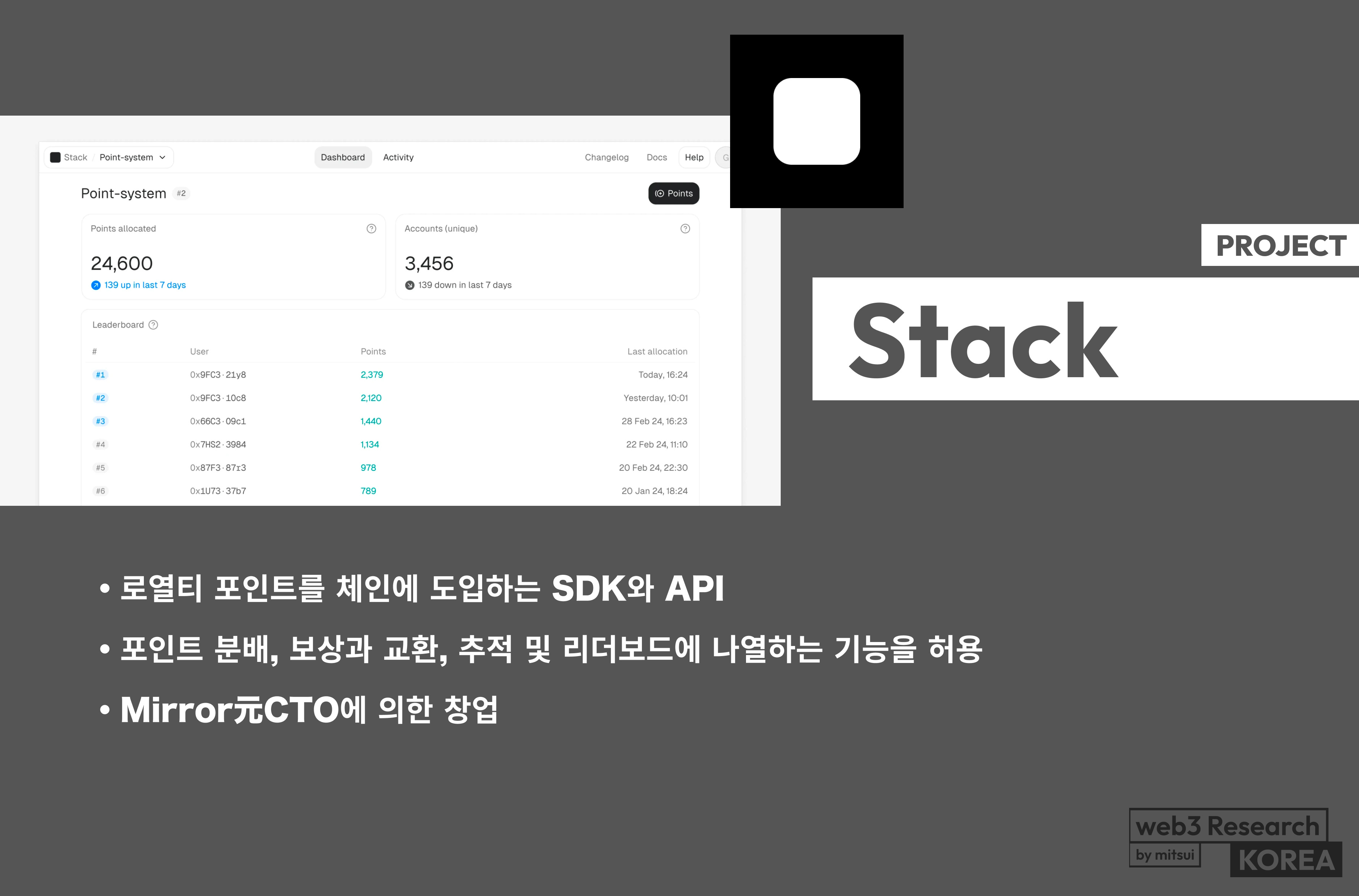 "Stack"은 로열티 포인트를 온체인으로 도입할 수 있는 SDK를 제공하는 서비스입니다. 회사들은 이 SDK를 자신들의 서비스에 통합함으로써 포인트를 배포하고, 보상으로 교환하며, 리더보드에 추적하고 나열할 수 있습니다.